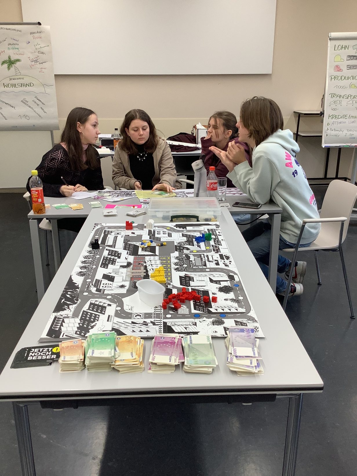 Unternehmen wurden gegründet, Rohstoffe je nach Angebot und Nachfrage eingekauft, Kredite aufgenommen und abgestottert, Produkte gelagert, erzeugt und verkauft, Mitarbeiter*innen angestellt und ausgebildet, Löhne und Steuern beglichen, Maschinen aufgewertet und abgeschrieben. Die jeweilige auch aus Schüler*innen bestehende Regierung hat diese Tätigkeiten unterstützt und Rahmenbedingungen geschaffen um die selbstgesetzten Gemeinwohlziele zu erreichen. Abstrakte Begriffe wie Niederstwertprinzip, …